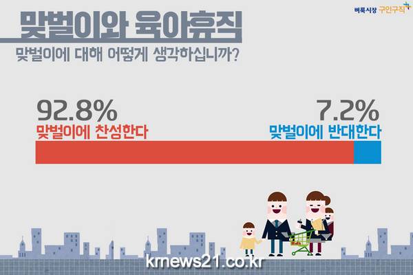 신문, 인터넷, 모바일로 구인구직정보를 제공하는 벼룩시장구인구직(대표이사 최인녕)이 직장인 1,061명을 대상으로 맞벌이에 대한 설문조사를 진행한 결과 전체 응답자의 92.8%가 ‘맞벌이에 찬성한다’고 답했다.