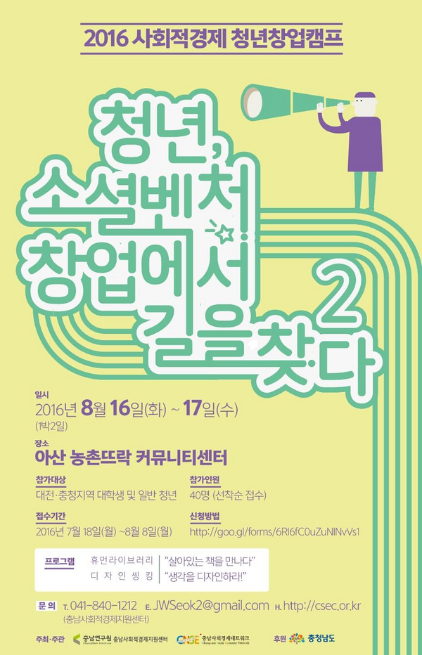 참가를 희망하는 자는 사회적경제지원센터 홈페이지(www.csec.or.kr)에서 신청서를 내려 받아 작성 후 이메일로 제출하면 된다.(문의 041-840-1212)