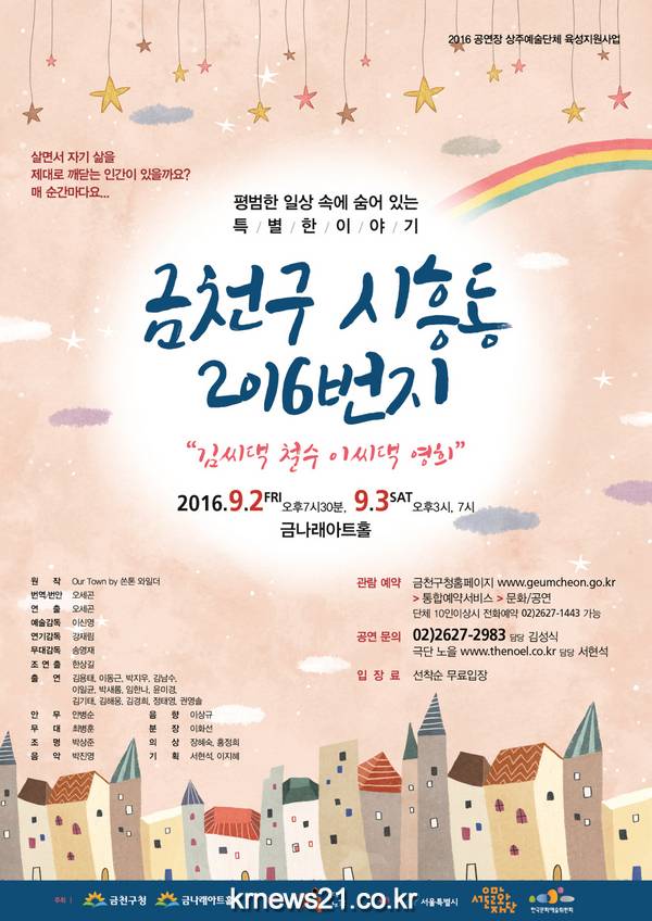 이번 공연은 금나래아트홀 상주예술단체인 극단노을이 현대극페스티벌에서 우수 작품상과 우수연기상(박우열 배우)을 받은 작품으로 ‘쏜톤 와일더’의 ‘우리 읍내’를 금천구 시흥이라는 지역을 배경으로 번안한 공연이다. 원작은 1938년 초연 이후 현재까지 전 세계에서 공연되고 있는 손꼽히는 현대의 명작이다.
