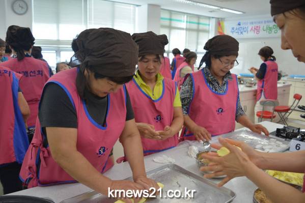 한국생활개선 신안군연합회(회장 고인숙)는 읍면회장 등 40명 회원들이 5일 관내 요양시설 및 보육원 4개소 500명을 위한 송편과 된장을 직접 만들어 “추석맞이 사랑 나눔 행사”를 펼쳤다.