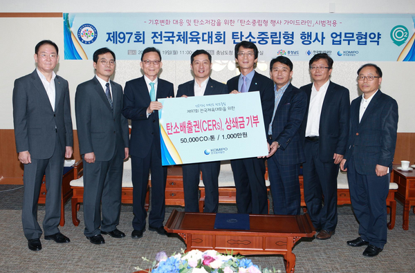 충남도가 다음 달 7일 막을 올리는 제97회 전국체육대회를 ‘탄소중립형 행사’로 치르기 위해 한국에너지공단, 한국중부발전과 손을 맞잡았다.도는 19일 도청 접견실에서 허승욱 부지사, 이광학 에너지공단 기후대응이사, 이덕섭 중부발전 발전처장 등이 참가한 가운데 ‘탄소중립형 행사 가이드라인 시범 적용을 위한 업무협약’ 체결식을 가졌다.이번 협약은 전국체전이 지난 6월 한국에너지공단으로부터 탄소중립형 행사 가이드라인 모델화 시범 사업에 선정됨에 따라 체결했다.협약에 따르면, 도는 전국체전에 맞춰 탄소중립 프로그램 홍보에 나서고, 온실가스 감축 목표 설정 및 탄소 저감 활동 수행, 에너지공단의 탄소중립형 행사 개최 지원을 위한 요청 자료 및 장소 제공, 홍보 부스 제공 등을 추진한다.에너지공단은 탄소중립형 전국체전 개최를 위해 대회 전 과정에 대한 컨설팅을 지원하고, 공동 홍보 부스 운영, 탄소중립 프로그램 인증을 위한 전 과정 지원 등을, 중부발전은 도의 탄소중립형 전국체전을 위해 탄소배출권(CERs) 5만CO2톤 및 상쇄금 1000만 원을 기부키로 했다.탄소중립형 행사는 지방정부나 기업 등에서 행사 때 에너지 사용으로 배출되는 온실가스에 대해 사회적 책임을 갖고 온실가스 감축 활동을 시행하는 사업이다.도 관계자는 “업무협약에 따라 이번 전국체전은 충남의 찬란한 역사와 문화가 어우러진 문화체전인 동시에, 에너지 사용 효율화와 탄소 발생 최소화를 실천하는 친환경 체전이 될 것으로 기대된다”고 말했다.