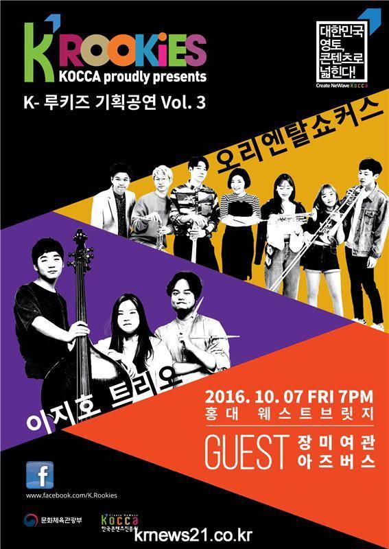 이번 공연에는 올해 선정된 8팀의 K-루키즈 중 일상의 느낌을 음악으로 담아내는 재즈밴드 ‘이지호 트리오’와 스카·레게 등의 장르를 도시적 사운드로 풀어내는 7인조 혼성 브라스밴드 ‘오리엔탈 쇼커스’가 참가해 열정적인 무대를 선보인다.