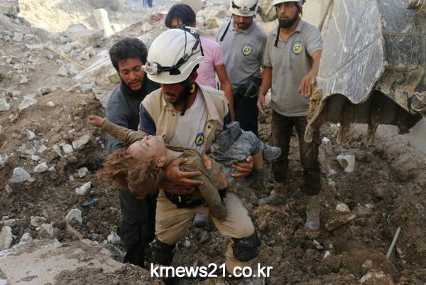 '화이트 헬멧'으로 알려진 시리아 민방위 자원봉사자들이 정부군의 공습을 받은 반군 지역의 건물에서 아이를 옮기고 있다.