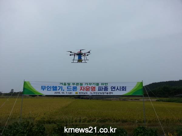 전라남도는 7일 무안 일로읍 망월들에서 농업인과 공무원 등 150여 명이 참석한 가운데 무인헬기와 드론을 활용한 자운영 파종 연시회를 개최했다.