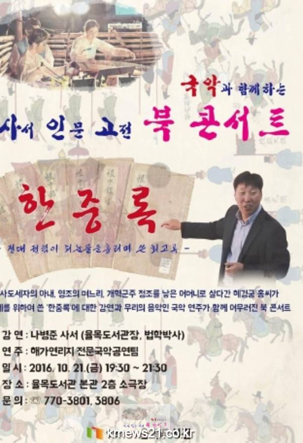 사도세자의 아내, 영조의 며느리, 개혁군주 정조를 낳은 어머니로 살다간 혜경궁 홍씨의 ‘한중록’을 주제로 율목도서관 나병준 관장이 직접 강연하며 전문 국악 공연팀 ‘해가연리지’의 가야금 등 국악 연주를 곁들인다.