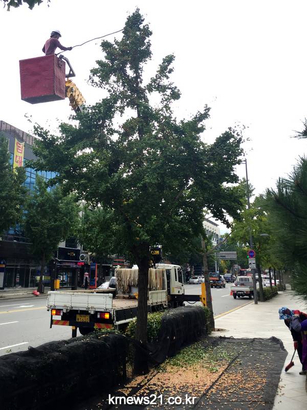 광주 동구(청장 김성환)가 은행나무 가로수 열매 악취로 인한 각종 민원을 최소화하고 쾌적한 환경을 제공하기 위해 지난 7일부터 ‘은행나무 열매따기 작업’을 집중 실시하고 있다고 밝혔다.