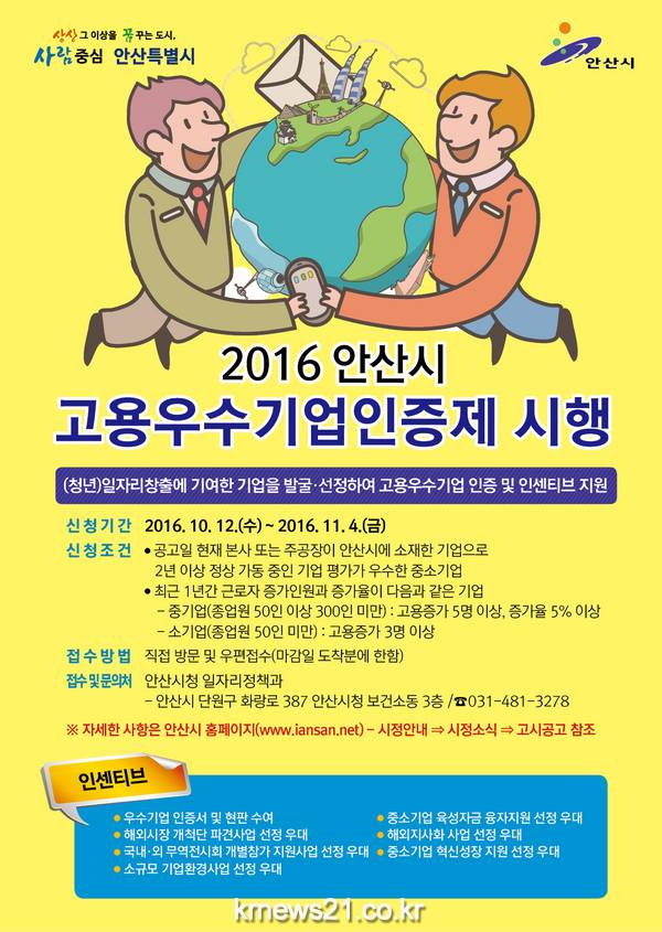 안산시(시장 제종길)는 어려운 경제여건에도 불구하고 일자리창출에 기여한 고용우수기업을 발굴·선정해서 각종 인센티브를 지원하는 ‘고용우수기업 인증제’를 시행한다고 밝혔다.