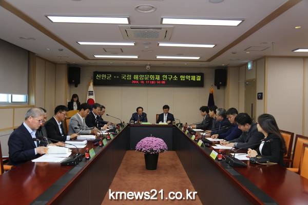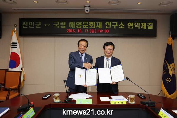 신안군과 국립해양문화재연수소(이귀영 소장)은 10월 17일 신안군청 영상회의실에서 신안군의 해양문화유산 조사와 신안선 40주년을 기점으로 신안선 해저유물 발굴지에 해양유물 전시시설을 건립하고자 상호 정보교류 및 문화발전을 위한 업무협약식을 가졌다.