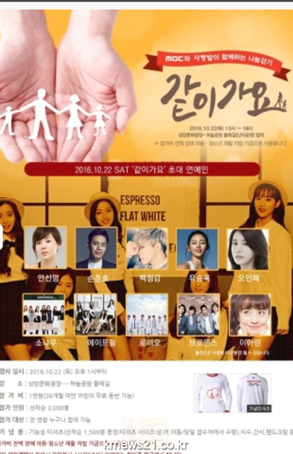뮤지컬 배우 손준호, 방송인 안선영, 가수 백청강, 소나무, 에이프릴 등 나눔의 뜻을 모은 스타들이 21일부터 23일까지 3일간 서울 MBC 상암문화광장에서 열리는 나눔 걷기 ‘같이 가요’에 함께 한다고 밝혔다.