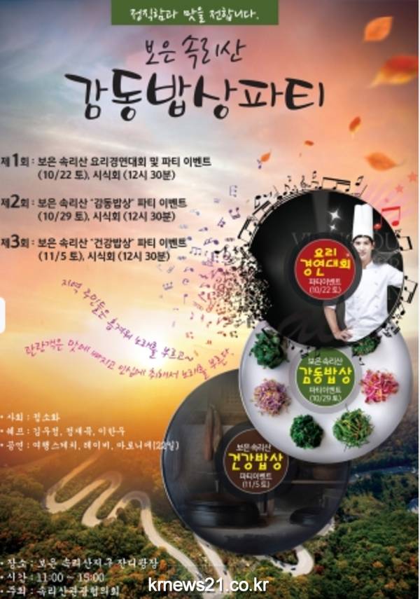 속리산관광협의회에서 주최하고 우리투어네트웍스에서 주관하는 이번 보은 속리산 감동밥상 파티는 10월22일부터 11월5일까지 매주 토요일 충북 보은군 속리산지구 잔디광장에서 진행된다.