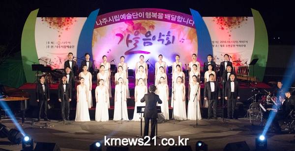 나주시립예술단(단장 이기춘 부시장)이 지난 10월 18일 저녁 7시 대호수변공원에서 시민 500여명이 참석한 가운데 가을음악회를 열어 뜨거운 호응을 얻었다.