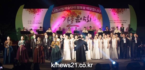 음악회는 90분동안 나주시립합창단(예술감독 김정연)과 국악단(예술감독 윤종호) 합동공연으로 이루어졌으며, 타악과 민요, 대중가요, 영화 주제음악 등 다양한 내용으로 구성되어 깊어가는 가을밤에 시민들의 감성을 울렸다.