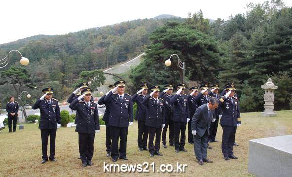 ▲ 김호승 보령서장. 보령경우회 회장 전윤수. 각 과장은 행사 전 보령시 남포면 소재 경찰묘역 묵념장면