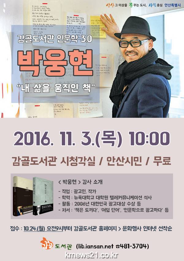 안산시 감골 도서관(관장 서근식)은 오는 11월 3일 광고인이자 베스트셀러 작가인 ‘박웅현’을 초청해 강연을 개최한다.