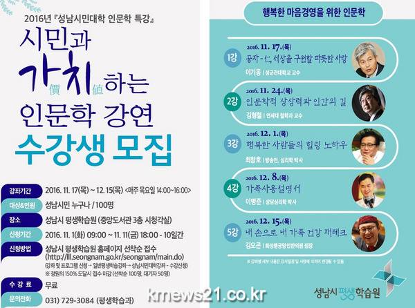 이를 위해 오는 11월 1일부터 11일까지 성남시민대학 5개 인문학 강좌 수강생 100명을 모집한다.
