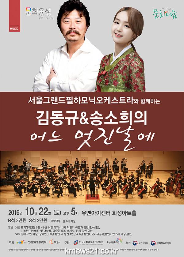 화성시 문화재단은 지난 10월 22일 화성아트홀에서 열린 ‘김동규&송소희의 어느 멋진 날에’ 공연을 성황리에 마쳤다. 이 공연은 한국문화예술회관연합회와 함께하는 ‘방방곡곡 문화 공감’ 사업의 일환으로 진행되었으며, 복권위원회의 기금으로 공연료의 일부를 지원받은 바 있다.