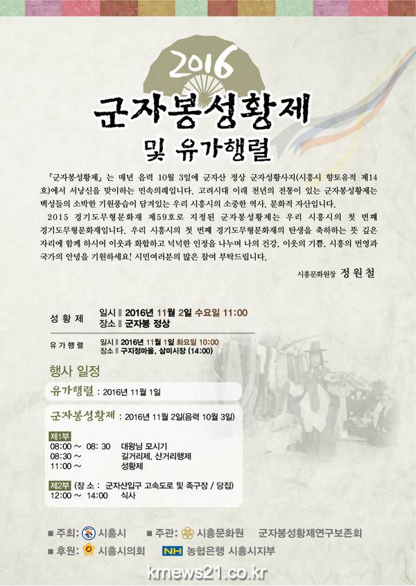 시흥시(김윤식 시장)가 주최하고 시흥문화원, 군자봉성황제연구보존회가 주관하는 2016년 시흥 군자봉 성황제가 11월 2일(수, 음력 10월 3일) 군자봉 정상 군자성황사지(시흥시 향토유적 제14호)에서 열린다.
