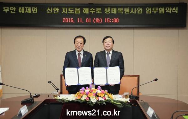 무안군(군수 김철주)과 신안군(군수 고길호)은 지난 1일 신안군청 영상회의실에서 『무안군 해제면 ~ 신안군 지도읍 해수로 생태복원사업』을 위한 양 지자체 간 공동업무협약을 체결했다.
