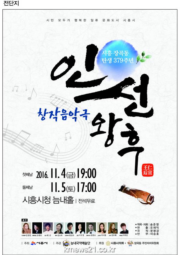 인선왕후 탄생 398주년 기념 창작음악극<</span>인선왕후>가 2016.11.4.(금) 19:00, 11.5.(토) 17:00 시흥시청 늠내 홀에서 개최된다. 시흥시 장곡동에서 출생하여 왕비에 오른 인선왕후의 파란만장한 삶을 그린 이번 작품은 늠내 국악예술단(단장 송선원)을 통해 가(歌), 무(舞), 악(樂)이 결합된 예술 작품으로 태어난다.