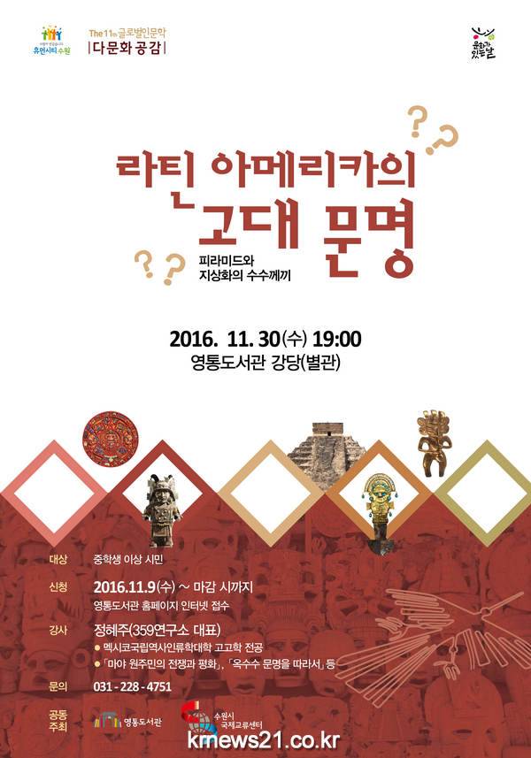 ‘다문화 특화 도서관’ 영통도서관(수원시 영통구 영통동)이 30일 오후 7시 별관 강당에서 ‘라틴아메리카의 고대문명, 피라미드와 지상화의 수수께끼’란 주제로 무료강좌를 마련한다.
