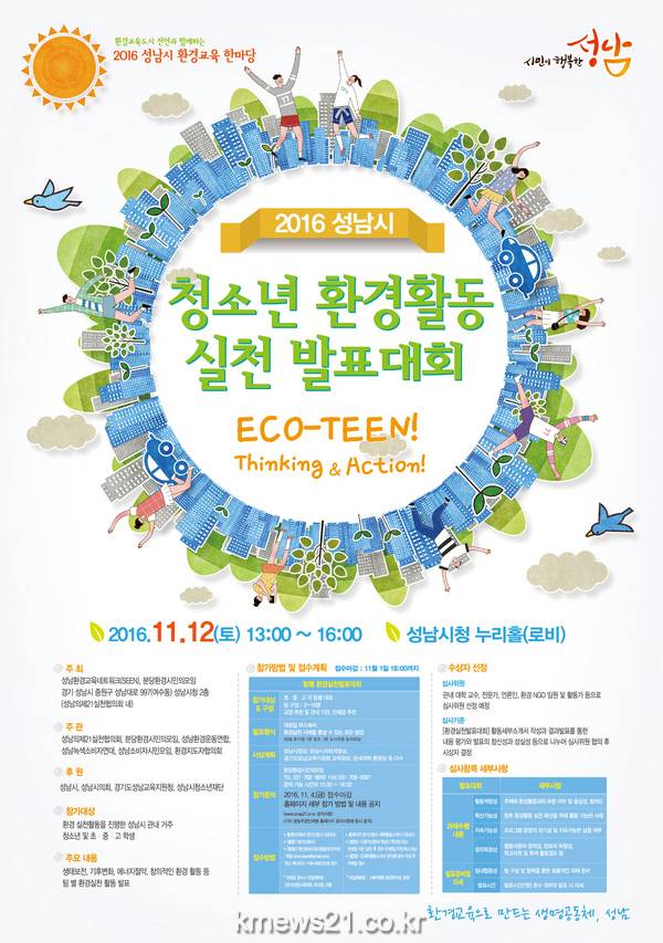 이번 대회에는 성남시 관내 거주 또는 관내 학교에 재학 중인 청소년들로 구성된 팀들이 참가해 생태보전, 기후변화, 에너지절약, 창의적인 환경 활동 등 실천 활동을 소개할 예정이다.