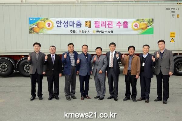 안성시(시장 황은성)는 11월 14일 “안성마춤 배 필리핀 수출 선적식”을 시와 농협 관계자 및 농업인이 참석한 가운데 안성마춤 농산물유통센터에서 가졌다.