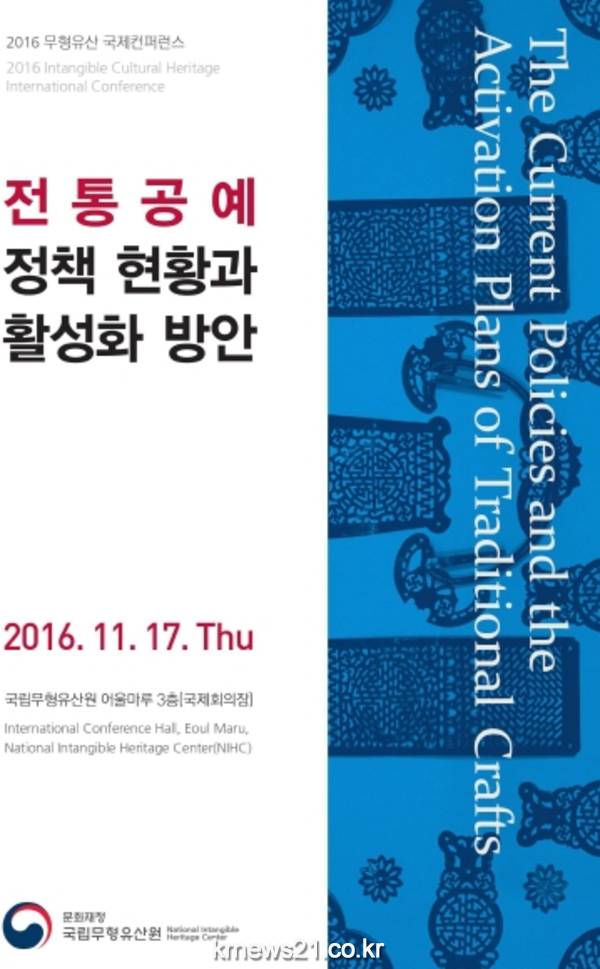 문화재청 국립무형유산원(원장 강경환)은 오는 17일 전북 전주에 있는 국립무형유산원 어울마루에서 ‘전통공예 정책 현황과 활성화 방안’이라는 주제로「2016 무형유산 국제컨퍼런스」를 개최한다.