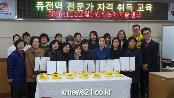 안성시농업기술센터(소장 유수형)는 9월 19일부터 11월 14일까지 퓨전 떡 요리 제조사 3급 자격 취득 교육을 실시하여 11월 21일 치른 자격 검정에서 15명이 3급 퓨전 떡 요리제조사 자격을 취득하였다.