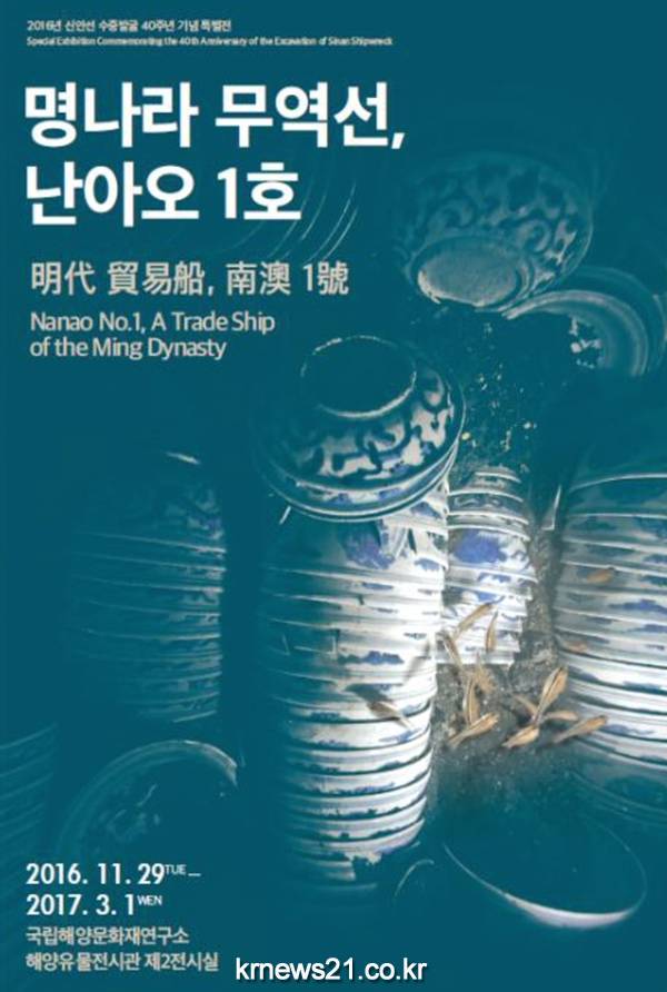 문화재청 국립해양문화재연구소(소장 이귀영)는 신안선 수중발굴 40주년을 기념하여 중국 광동성박물관과 공동으로 「명나라 무역선 난아오(南澳) 1호」 특별전을 오는 29일부터 2017년 3월 1일까지 해양유물전시관 제2전시실에서 개최한다.