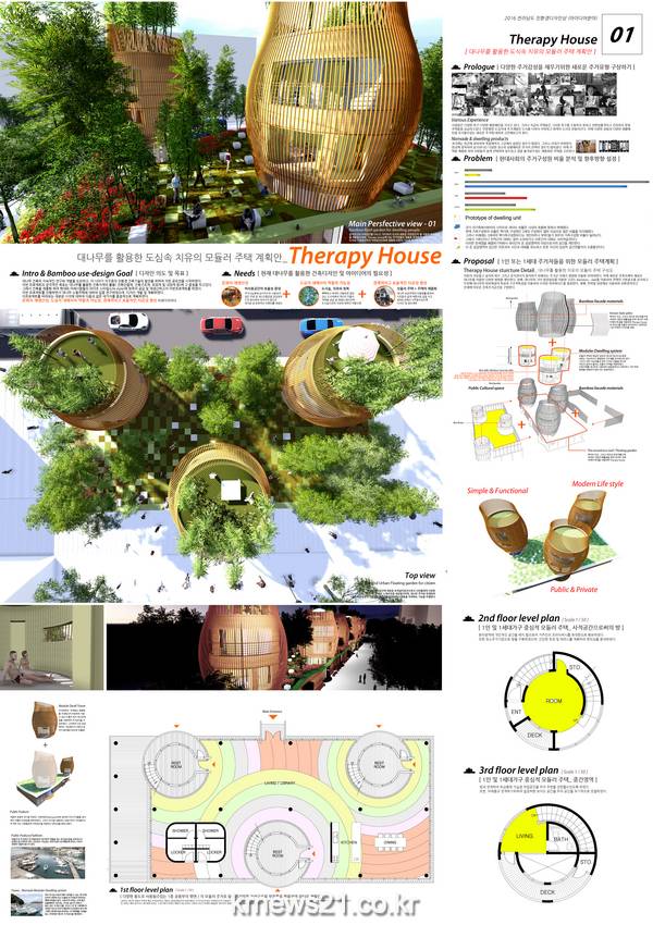 대상 수상작인 ‘Therapy House’는 도심지 내 친환경 건축물로서 문화 재생산성과 자연공간 확대, 도심 속 치유를 목표로 대나무를 활용한 모듈러 주택계획안이다. 새로운 주거 유형과 친환경 공간을 제시한 점이 높은 평가를 받았다.