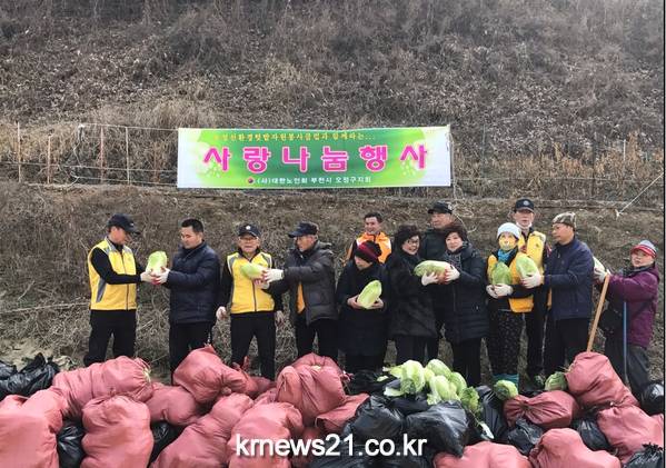 대한노인회 부천시 오정지회(지회장 서병춘)은 지난 11월 25일 텃밭 가꾸기사업으로 수확한 배추 250포기를 ‘열린문 선교쉼터(출소 장애인 자립지원 시설, 이용인원 10명)’ 에 전달하였다.