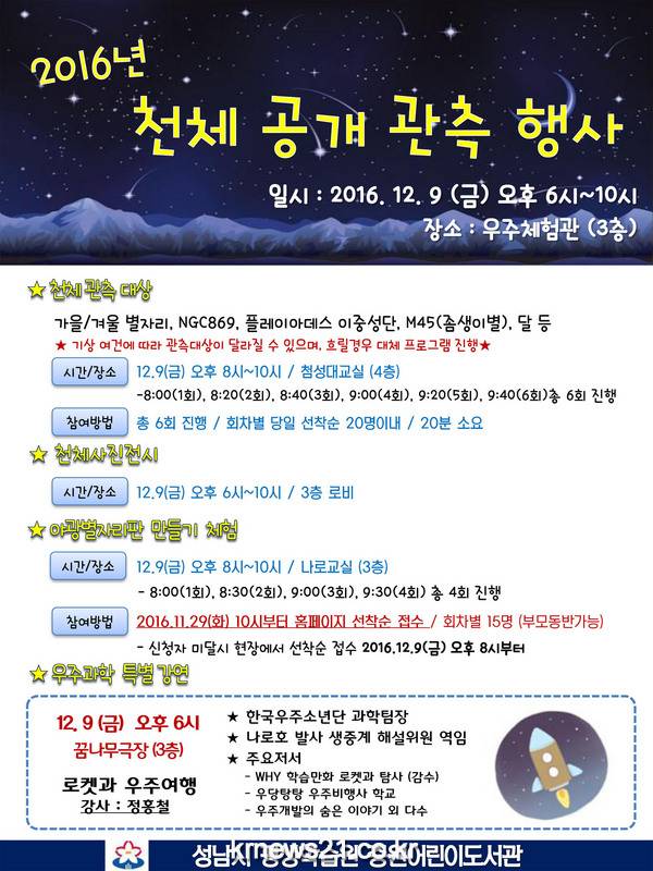 성남시(시장 이재명) 중원어린이도서관은 오는 12월 9일 도서관 4층 첨성대 교실에서 ‘천체 관측 행사’를 연다.