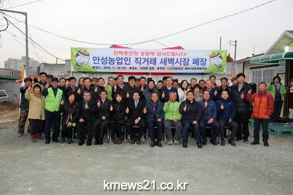 안성농업인 새벽시장 운영협의회(회장 박운용)는 지난 4월 23일 안성지역의 새로운 명물로 자리 잡은 새벽시장을 개장하여 11월 30일까지 매일 오전5시부터 9시까지 운영된 농업인 새벽시장의 폐장식을 가졌다.