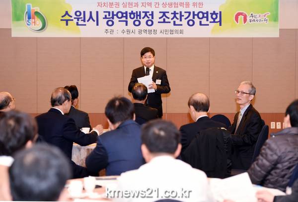 염태영 수원시장의 인사말, 특강과 토론으로 진행된 강연회에는 광역행정시민협의회, 수원시 자치분권협의회 위원, 주민자치위원장, 도·시의원 등 100여 명이 참석했다.