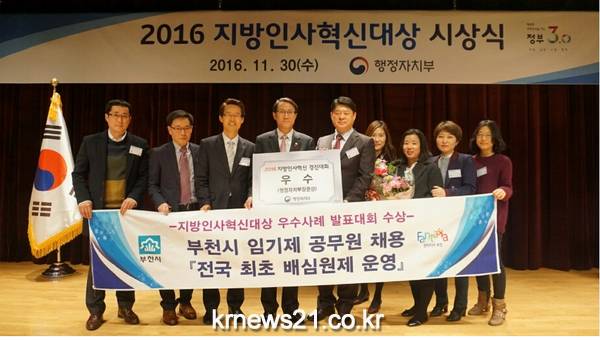 부천시가 30일 행정자치부 지방인사혁신단 주관으로 열린 ‘2016 지방인사혁신대상’ 에서 우수상(행정자치부장관상)을 받는 영예를 안았다.