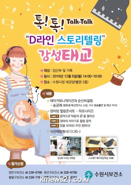 수원시보건소가 5일 수원시청 대강당에서 임산부를 위한 특별 프로그램 ‘톡!톡!(Talk-Talk) D라인 스토리텔링 감성태교’를 열었다.