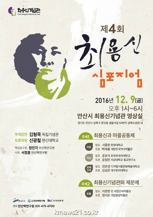 안산시(시장 제종길)는 오는 12월 9일 오후 1시 최용신 기념관 1층 영상관에서 제4회 ‘최용신 학술심포지엄’을 개최한다.