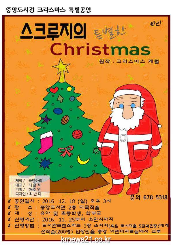 안성시립중앙도서관은 크리스마스를 맞이하여 오는 18일 일요일 오후 3시, 중앙도서관 2층 다목적 홀에서 어린이연극 『스크루지의 특별한 크리스마스』공연을 개최한다.