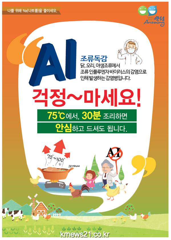 안성시보건소장은 AI상황임을 감안, 안전 포스터 배부를 통해 안성시민의 먹거리 안전을 확보하면서 지역경제 안정에도 기여할 수 있도록 가금류 취급에 특히 만전을 기해달라고 당부했다.