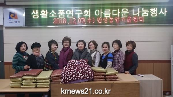 안성시농업기술센터(소장 유수형)에서 여성 전문리더로 육성하고 있는 생활소품연구회에서는 12월 7일 독거노인들을 위한 아름다운 나눔 행사를 가졌다.