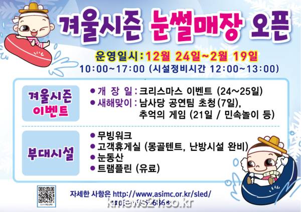 눈썰매장은 24일부터 내년2월 19일까지 운영할 계획이며 운영시간은 매일 10시부터 오후 5시까지로 요금은 성인7천원, 청소년6천원, 어린이5천원이며 기관이나 단체에서 20인 이상 참여할 경우 1천원 할인을 받을 수 있다.