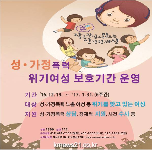 부천원미경찰서(서장 이문수)에서는 가족 간의 갈등이 잦아지는 연말과 설 명절을 대비하여 성폭력·가정폭력으로 피해 위기에 처한 여성들을 찾아 적극적으로 보호·지원을 하기 위해 ‘성폭력·가정폭력 위기여성 보호기간(16.12.19 ~ 17.1.31)’을 운영한다."고 밝혔다.