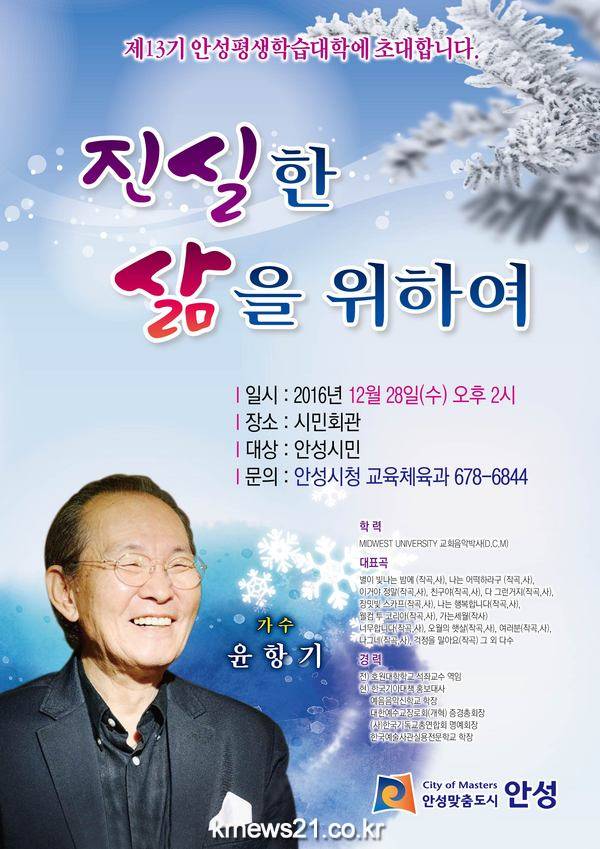 안성시는 오는 12월 28일(수) 오후 2시 시민회관에서 내빈 및 수강생 500여명이 참석한 가운데 2016년 제13기 안성평생학습대학 수료식을 갖는다고 전했다.