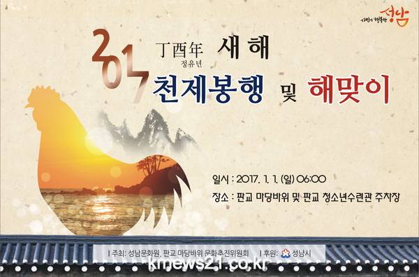 성남문화원(원장/김대진)과 판교마당바위 문화추진위원회(위원장/한문수)는, 丁酉年(정유년)을 맞이하는 첫 아침을 성남시의 발전과 시민의 행복을 기원하고, 새해 소망을 기원하는 「2017 새 해, 천제봉행 및 해맞이」행사를 오전 6시 50분부터 판교 마당바위에서 개최한다.