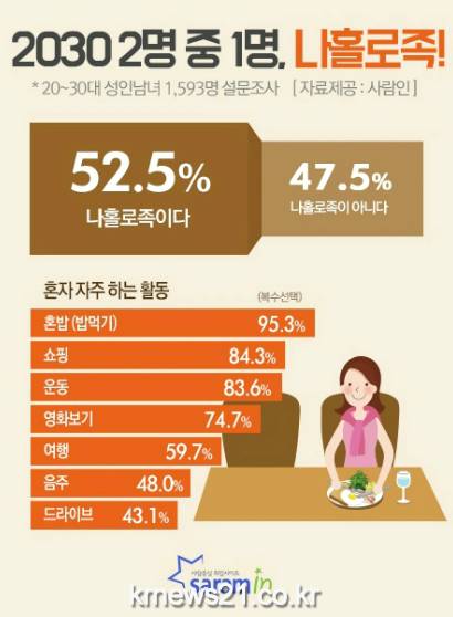 1인 가구가 증가하고 혼자만의 여유를 중시하는 문화가 20~30대 젊은층을 중심으로 확산됨에 따라, 혼밥, 혼술, 혼행, 혼영 등 관련 단어들이 쏟아져 나오고 있다. 실제로 사람인 조사 결과 2030세대 성인남녀 2명 중 1명이 본인이 나홀로족에 속한다고 생각하고 있었다.