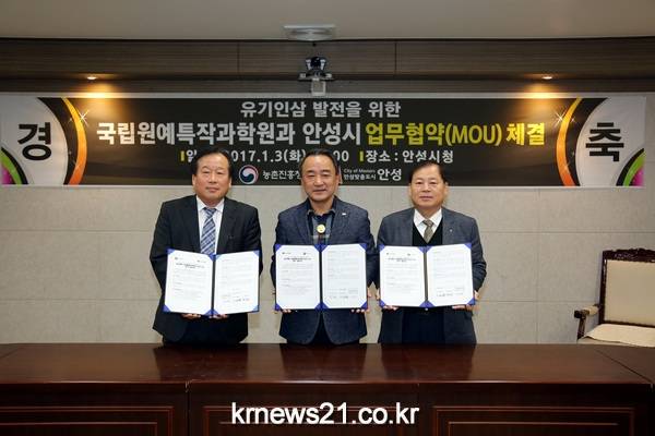 안성시는 1월 3일, 11시 안성시청에서 농촌진흥청 국립원예특작과학원과 ‛인삼 유기재배 연구 협력을 통한 유기인삼 재배 확대 및 산업 활성화’ 협약식을 체결했다.