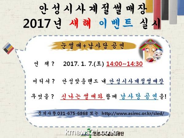 안성시시설관리공단(이사장 박상기)에서 운영하는 안성시 사계절 썰매장은 2017년 정유년 새해를 맞아 오는 7일‘새해맞이 문화이벤트’를 실시한다고 밝혔다.
