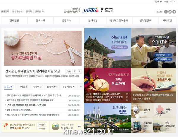 진도군이 현재 운영중인 군 대표 홈페이지를 포함해 22개 홈페이지를 5개 홈페이지로 통폐합 개편하고 사용자 중심의 반응형 홈페이지로 새로 구축, 지난 10일부터 서비스를 시작했다.
