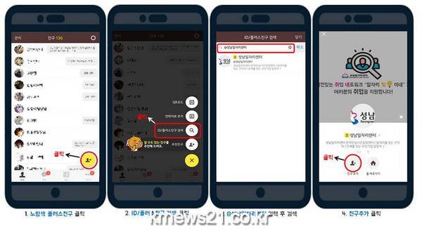 카카오 톡 플러스친구에 ‘성남일자리센터’를 추가하면 성남시 일자리전문 직업상담사인 일자리 쌤과 1 대 1 채팅이 이뤄져 구직 또는 구인과 관련된 질문을 하고 답을 얻을 수 있다.