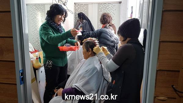 광주 엔젤봉사단이 한겨울의 추위도 아랑곳하지 않고 완도 생일도를 찾아 이·미용 봉사활동을 전개하고 있다.